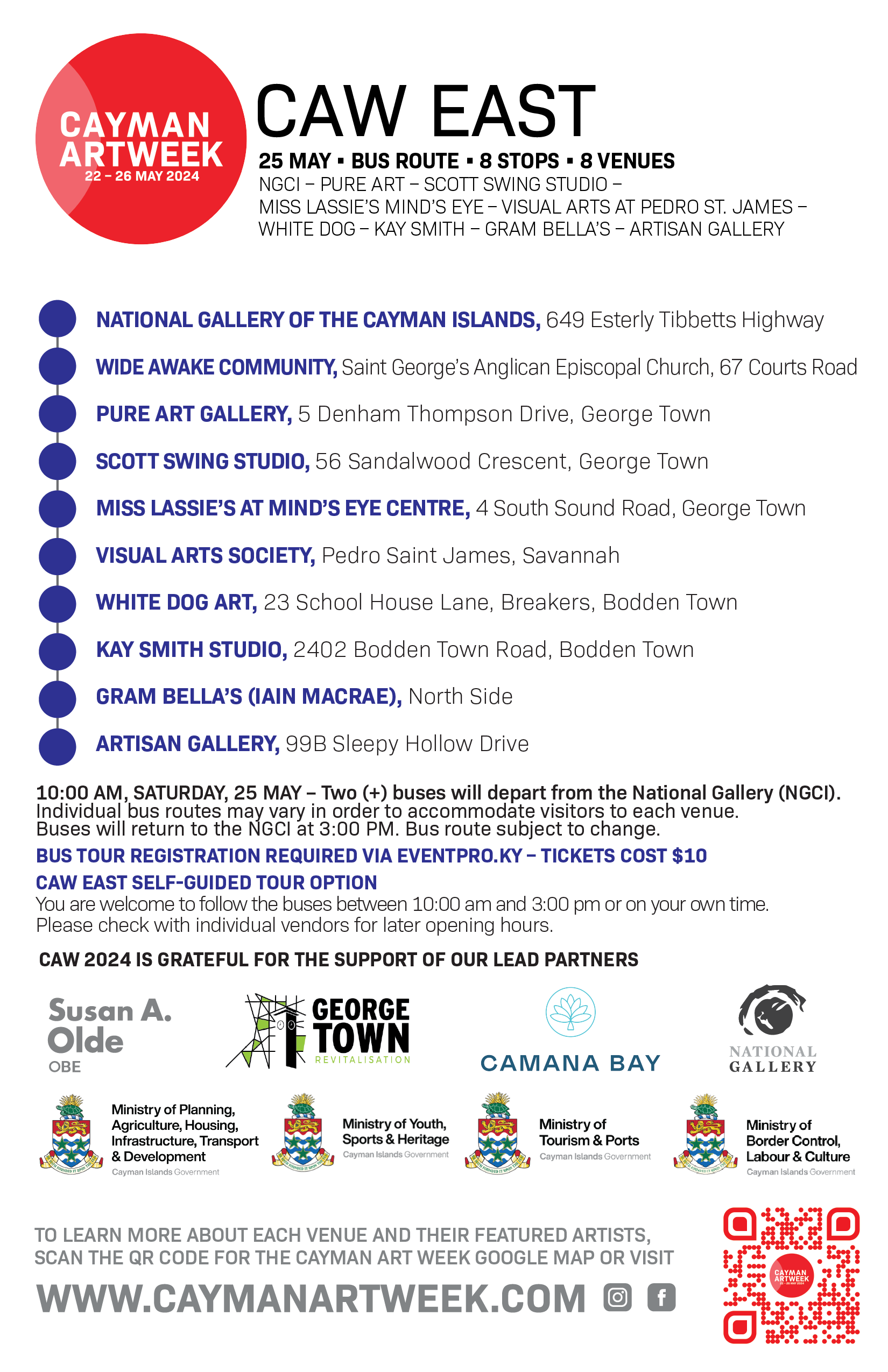 The CAW East bus tour will leave the National Gallery of the Cayman Islands at 10:00 AM on 25 May and return at 3:00 PM.