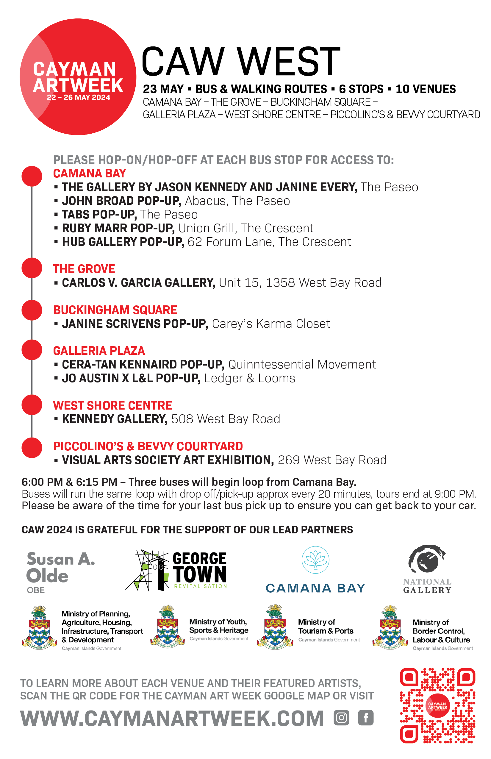 Cayman Art Week 2024 has three Bus Tours: one hop-on/hop-off Bus Tour for CAW West on Thursday evening (23 May), one hop-on/hop-off Bus Tour for CAW Central/ Art In The City on Friday evening (24 May), and a third guided Bus Tour for CAW East on Saturday during the day (25 May).
